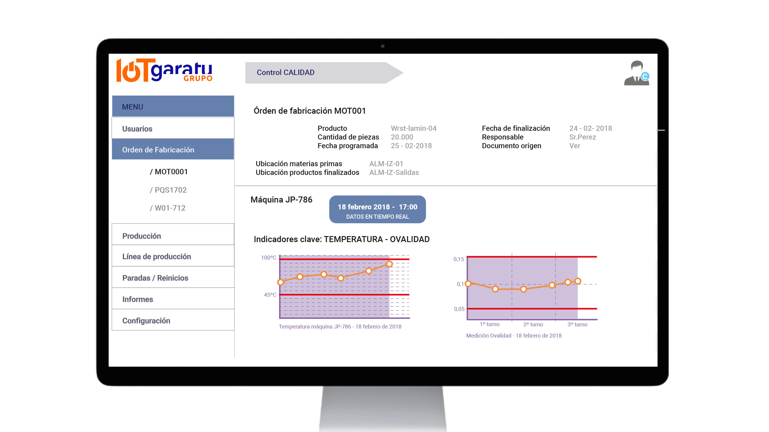 Operarios: accederán a la información de las órdenes de fabricación (OF) establecidas para el turno del operario. Algunas de las variables que el operario podrá visualizar:
